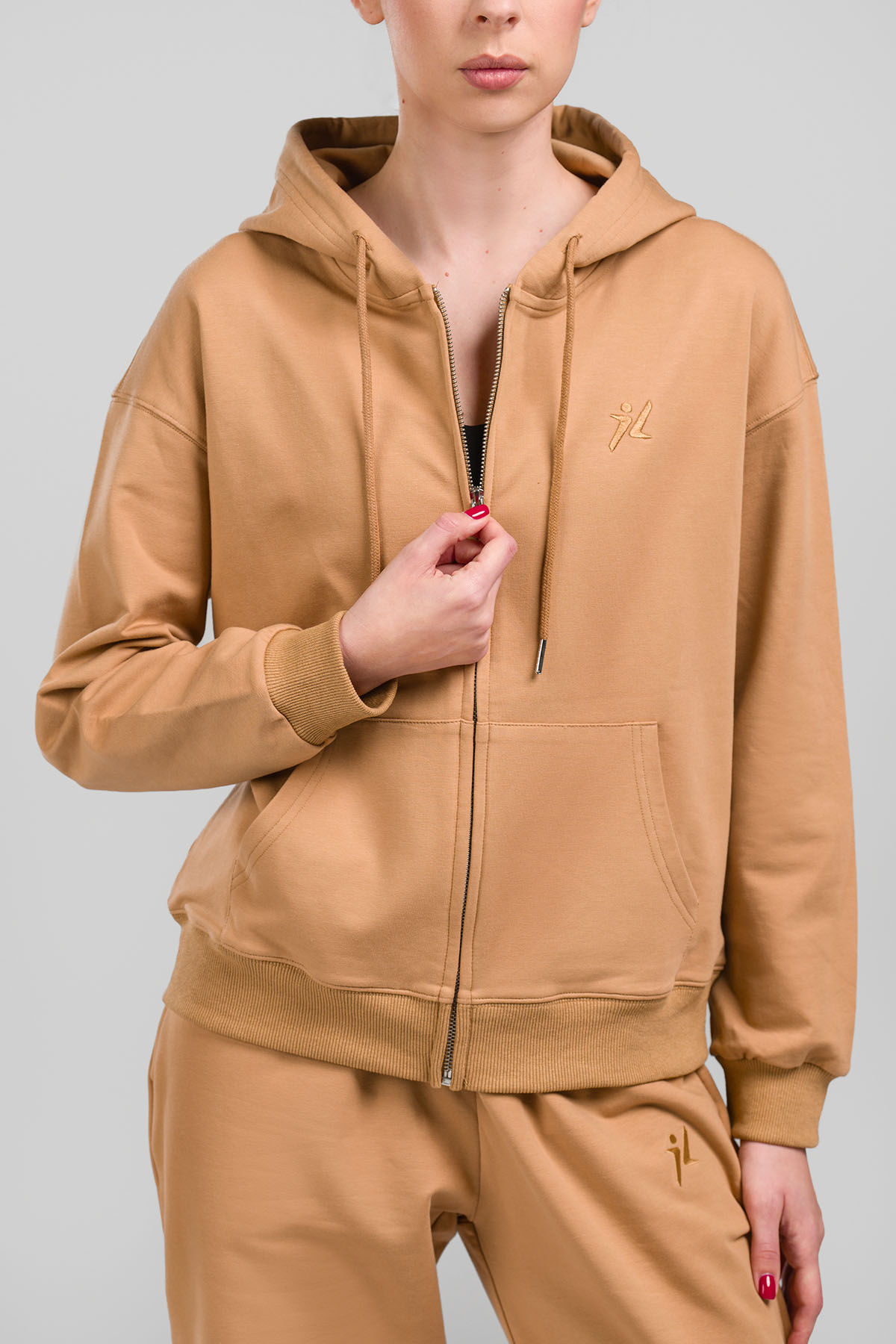 Becare Zip dukserica ima prednje otvaranje sa metalnim rajsferšlusom, što je čini praktičnom za različite temperature i slojevito oblačenje. Kapuljača je blago strukturirana, sa pamučnim učkurima i metalnim završecima. Na prednjem delu nalazi se klasičani džepovi, dok su ranfle na rukavima i donjem rubu elastične, dovoljno čvrste da zadrže formu, ali bez osećaja stezanja. Logo je suptilno vezen u boji materijala, što doprinosi čistom, minimalističkom izrazu.